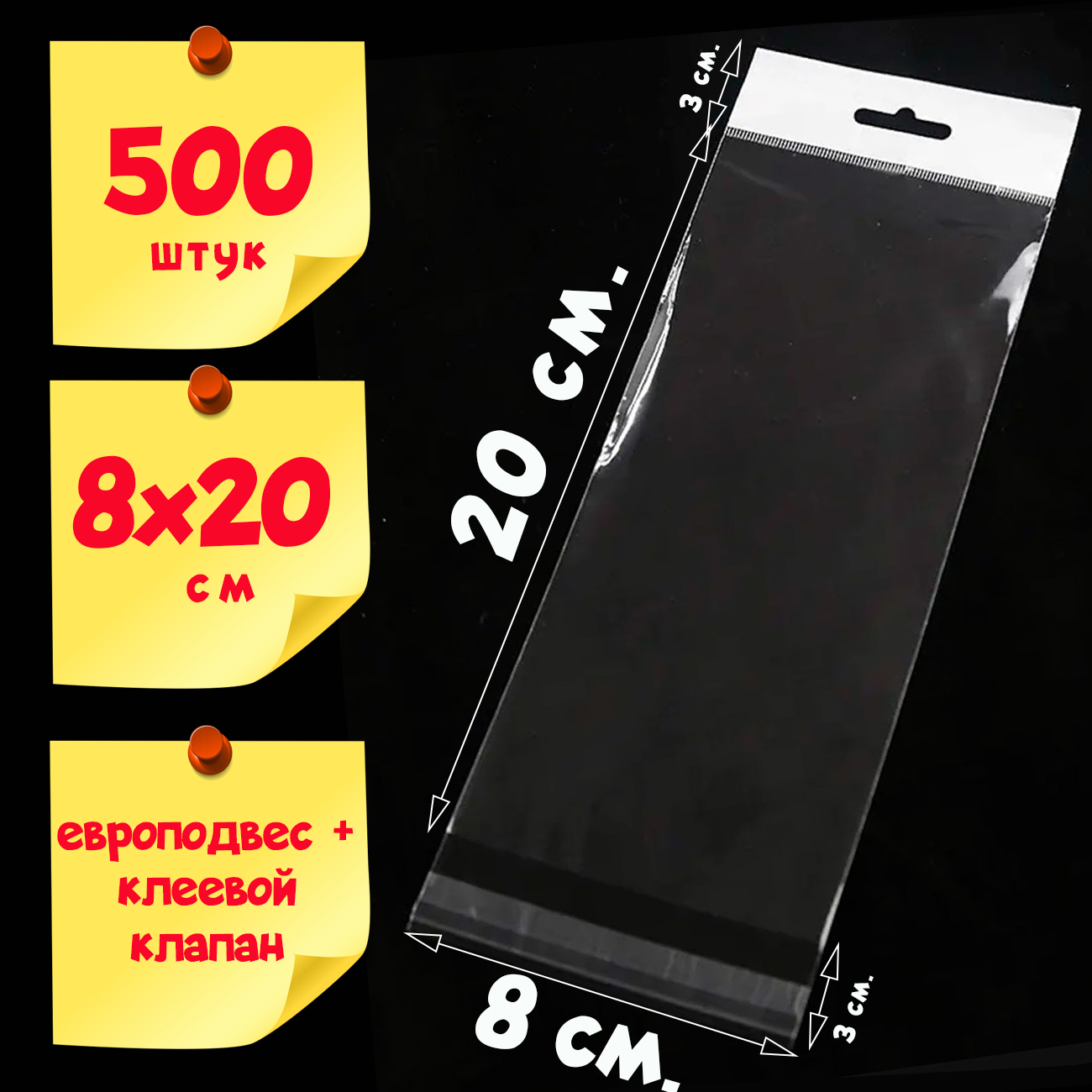 500 пакетов 8х20+6 см с белым европодвесом и клеевым клапаном